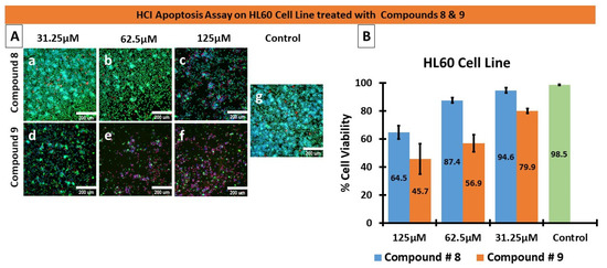 HCI-based apoptosis assay. (A) HL60 cells were treated with three concentrations (31.25 µM, 62.5 µM, and 125 µM) of compounds # 8 (a–c), # 9 (d–f), and PBS for the negative control (g) for 48 h. The nucleus (blue) was stained with HOECHST 33342, the cytoplasm (Green) was stained with Calcein AM, and dead cells (Red) were stained with Propidium Iodide (PI). Compound # 9 was more potent than compound 8, indicated by the presence of dead cells (red) and diminished Calcein AM (Green) staining. (B) HCI Cell Health Digital Analysis MetaXpress software generated the graph quantifying the cell viability, seen in B, as a percentage of HL60 cells treated with the compounds. At low concentrations of 31.25 µM, compound 9 displayed approximately 20% cytotoxic efficacy and approximately 54% cytotoxicity at 62.5 µM concentrations.