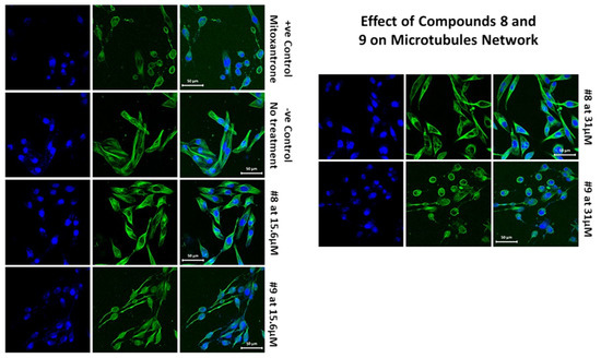 MDA- MB 231 cells were treated with compounds 8 and 9 at two concentrations, 15.6 and 31.25 µM, for 48 h. The cells were stained with tubulin tracker™ Green (Cat #T34075) in HBSS for 30 min and nucleus stain HOECHST33342 (blue) for 5 min. The samples were imaged with Zeiss laser-scanning 780 microscopes.