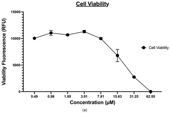 HL60 cells were seeded in a 96-well plate at a density of 20,000 cells per well. The cells were treated with compounds 8 and 9 and negative control (PBS) for 48 h. Three graded concentrations were used for the treatment, 31.25 µM, 62.5 µM, and 125 µM. After the treatment, the cells were stained with Calcein AM (2 µg/mL), HOECHST33342 (2.5 µg/mL), and Propidium Iodide (2.5 µg/mL) for 45 min at 37 °C and 5% CO2. Plates were imaged on a Molecular Devices ImageXpress® Microsystem, and the acquired image data were analyzed using MetaXpress® software, Molecular Devices, Downingtown, PA, USA. The Cell Health module available in the MetaXpress software was used to measure the percentage viability of live and dead cells. Experiments were performed in triplicates.