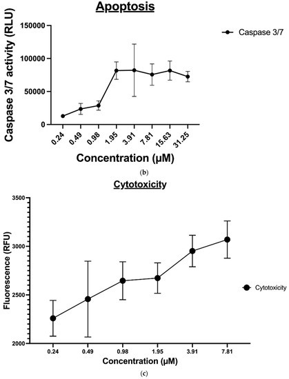 The Promega ApoTox-Glo® triplex assay was conducted as described by the manufacturer. Briefly, the cells were incubated at 37 °C for 12 h and then treated for 24 h with various concentrations of compound 9 [29,30]. Next, 100 µL of the Viability and Cytotoxicity Reagent was added to each well and briefly mixed on an orbital shaker. Plates were incubated at 37 °C for 30 min, and the fluorescence was measured at the following two-wavelength sets—400Ex/505Em (Viability) and 485Ex/520 Em (Cytotoxicity)—using the Envision plate reader (Perkin Elmer). Subsequently, the Caspase-Glo® 3/7 Reagent (100 µL/well) was added, plates were briefly mixed on an orbital shaker (300 to 500 rpm for ~30 s), followed by an extra 30 min incubation at RT. Finally, to determine the level of apoptosis, the luminescence associated with caspase 3/7 activation was measured using an Envision plate reader (Perkin Elmer) [52,53].