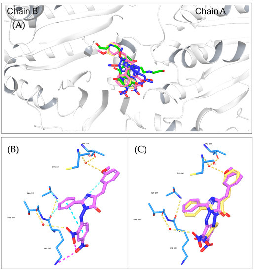 Two computational tools were utilized to predict the absorption, distribution, metabolism, and excretion (ADME) of the synthesized compounds, SWISSADME (http://www.swissadme.ch/) (accessed on 14 November 2021) [57] and QikProp (QikProp, Schrödinger, LLC, New York, NY, 2021). The important pharmaceutical properties that were selected for evaluation were gastrointestinal (GI) absorption, blood–brain barrier (BBB) permeability, P-glycoprotein (P-gp) substrate, lipophilicity (log Po/w), and solubility (Log S).