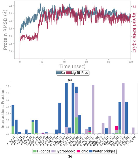 To investigate the stability of the docking interactions, we performed a molecular dynamic simulation run for the best docking pose for tubulin and compound 9. Desmond was utilized to run the simulation, and the TIP4P water molecules were added to the complex (21206 water molecules). The system was neutralized by adding 28 Na+, and the NPT ensemble was utilized to run the simulation. The complex was relaxed before the production run, and the timescale for the simulation run was 100 ns. Several simulation frames and simulation interaction diagrams (SID) were utilized for the analysis.
