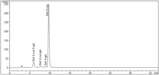 Figure 1 shows the presence of detected anthocyanins in the eggplants. The major anthocyanin in eggplant in the present study was delphinidin-3-O-rutinoside (del-3-rut) (Table 4). The LC-MS data in the present study also confirmed the presence of del-3-rut-5-glc, del-3-rut-glc and del-3-glc, although there were also trace anthocyanins. The eggplants exhibited significantly higher del-3-rut concentrations in the peel of ‘Aydin Siyahi’ (avg. 1162.22 mg/g fw), followed by ‘Kadife Kemer’ (avg. 336.59 mg/kg fw) and ‘Trabzon Kadife’ (avg. 215.11 mg/kg fw), in comparison to the pulp (range: 45.45–194.62 mg/kg fw).