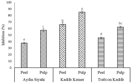 α-Amylase inhibition activity was highest in the peel (66.37%) and pulp (85.03%) from ‘Kadife Kemer’ but much lower in ‘Trabzon Kadife’ (45.93 and 62.35%, respectively) and ‘Aydin Siyahi’ (37.73 and 57.49%) (Figure 2) in the present study. This assumed that the phenolic composition of the pulps exhibited higher inhibitory activities than that in the peel. Previous research with selected food extracts reported an association between antioxidant activity and α-amylase inhibition activity [20]. The purple eggplant (Kadife Kemer) exhibited moderate AC values determined by the DPPH and ORAC assays, although it had the highest α-amylase inhibition activity. In a much earlier study, Kwon et al. [20] compared the α-amylase inhibition activity of phenolics in the peel and pulp of ‘Purple’, ‘White’, ‘Graffiti’ and ‘Italian’ eggplant cultivars. They reported moderate low α-amylase inhibitory activities in these four eggplants combined with moderate AC values [20]. Similarly, the white-coloured eggplant (Trabzon Kadife) in the present study exhibited comparable α-amylase inhibitory activities in comparison to the black eggplant (Aydin Siyahi).
