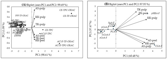 PCA is the most popular multivariate statistical analysis used by almost all scientific disciplines. It analyzes a data table representing observations described by several dependent variables, which are, in general, inter-correlated. Its aim is to extract the important information from the data table and to express this information as a set of new orthogonal variables known as principal components. It also represents the patterns of similarity of observations and variables by displaying them as points in maps [47] that can summarize the dimensionality of high-dimensional complex data through a smaller set of “summary indices” that can be easily visualized and analyzed. In recent years, researchers have used this method of analysis to determine whether any of the observations or variables differ significantly among treatments [48,49,50]. In the present study, the PCA was carried out to study the variation in contents of the total phenolics, phenolic acids and chlorogenic acids liberated in four forms, the anthocyanin/s (del-3-rut), and the antioxidant capacity values in the peel and pulp of three eggplants (black, purple, and white). The PCA showed that all of the chemical components determined in the eggplants were closely associated and significantly (p < 0.05) positively and strongly correlated with the peel and pulp, showing a total variance ranged between 81.56 and 99.93%. Accordingly, two principal components, explaining 99.69% of the overall variance (PC1; 98.61% and PC2; 1.08%), divided the pulp and peel in conjunction with the ORAC values and TPCs (Figure 3A). Noticeably, the PC1 (98.61%) is clearly identified with the pulp and closely associated with the ORAC values and the phenolic contents (upper positive side). However, the TPC and TF contents of the ACYF in the eggplant peels were closely associated with the ORAC on the PC1 (lower positive side). The major factor scores contributing to the PC1 (positive side) were CE/ACYF-TPC/TF-ORAC (5.947 and 4.155) (Table 5). In contrast, the main contributors to the PC2 (the negative side) were the AF and PPF in relation to the AC, but these were very low, and the data are not shown. The common feature of ‘Aydin Siyahi’, ‘Kadife Kemer’ and ‘Trabzon Kadife’ was thus the highest content of polyphenolic compounds in the CE and ACYF in the peel and the ORAC values.