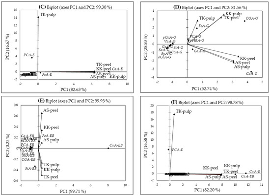 FeA and CaA in the ester-bound (EB) forms were closely associated with the peel of ‘Aydin Siyahi’ and ‘Kadife Kemer’, the pulp of ‘Aydin Siyahi’, the pulp of ‘Trabzon Kadife’ and ‘Kadife Kemer’ and the peel of ‘Trabzon Kadife’ on the right on PC1, explaining 99.71% of the data variation. The remaining phenolic acids were associated within the peel and pulp only (Figure 3E). In contrast to the correlations of those above, three phenolic acid forms—the phenolic acids in EB form—were significantly and strongly correlated within the peel and pulp among the eggplants (r = 0.991–1.000, p < 0.05). The largest association belongs to F1 for CaA (8.055), while the remaining factor scores (F2–F5) have low associations (Table 5). Overall, the PCA was carried out separately for all forms of phenolic acids determined in the eggplant peel and pulp (Figure 3F). The PCA model accounted for 98.78% of the total variance (PC1, 82.20%; PC2, 16.58%). Again, the CaA-E and -EB forms were closely associated with the peel and pulp of the eggplants on PC1, except for the pulp of ‘Trabzon Kadife’, which closely associated with the PCA-E form. In addition, no correlation was found between the pulp of the white eggplant (Trabzon Kadife) and any forms of phenolic acids, while the peel and pulp of the remaining two eggplants were significantly and strongly correlated (r = 0.967–0.993, p < 0.05). The largest association belongs to F1 for CaA-E (11.632) and -EB (10.054), while the remaining factor scores have low associations (Table 5).