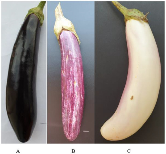 Eggplant exhibits wide diversity in color (purple, purple/black, green, or variegated), size (ave. 210.4 g, range 42–464) and shape (elongated, ovoid, or slender). Based on fruit shape, eggplant is classified as egg-shaped (S. melongena var. esculentum), long and slender in shape (S. melongena var. serpentinum), or dwarf types (S. melongena var. depressum). The oblong to elongate-shaped dark purple, purple/black or violet eggplants are used worldwide, but other varieties that differ in color, size and shape are also known [3,4,6,7,10,11,12].