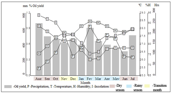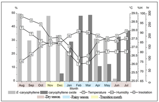 Climatic parameters, such as the monthly average of temperature, insolation, precipitation, and relative humidity, were monitored for one year (August 2020 to July 2021) to evaluate the seasonal influence on the yield and leaf essential oil composition of E. patrisii. Mean values of insolation ranged from 103.4 h (February) to 287.8 h (August), relative humidity from 75.5% (August) to 90.8 and 90.2% (February and March), average temperature from 26.0 °C (February) to 28.2 °C (August), and the average rainfall from 54.3 mm (August) to 614.1 mm (February). Based on the precipitation data, the rainy season occurred from January (328.3 mm) to May (451.2.4 mm), and the dry season from June (212.4 mm) to October (266.0 mm). In addition, November (502.1 mm) and December (213.6 mm) was the period of transition between these two seasons (Figure 1).