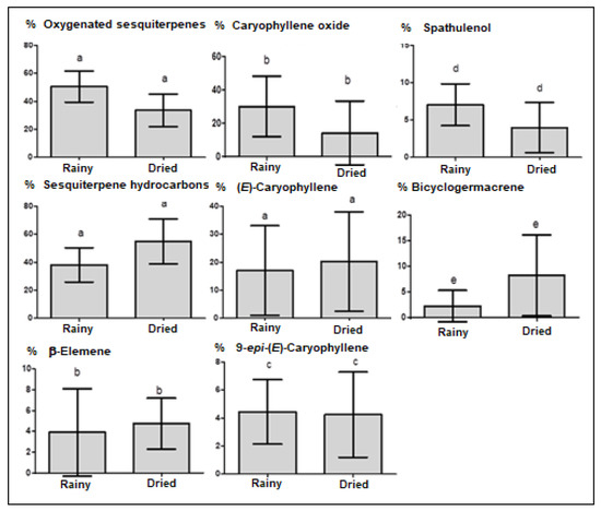 Compound classes and primary constituents of the E. patrisii essential oils on rainy and dried seasons: media and standard deviation. Values with the same letters in the bars do not differ statistically in the Tukey test (p > 0.05).