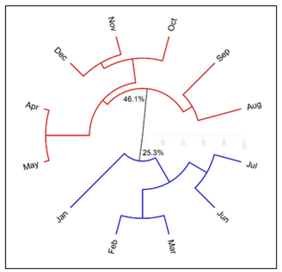 Group I, with 25.3% similarity between the samples, comprises the leaf oils collected in January, February, March, June, and July, whose main constituent was caryophyllene oxide. Group II includes oil samples from April, May, August, September, October, November, and December, which presented (E)-caryophyllene as the main component, showing 46.1% similarity to each other. The HCA plot shows that the two groups were formed differently during the collection period.