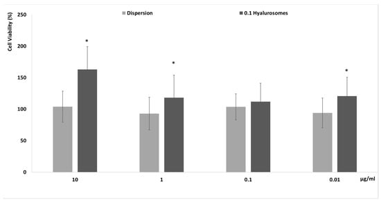 Cell viability of fibroblasts treated for 48 h with extract in dispersion or loaded in hyalurosomes diluted to reach 10, 1, 0.1, 0.01 μg/mL of extract. Data are reported as mean values (n = 9) ± standard deviations (error bars) of cell viability expressed as the percentage of untreated cells (100% of viability). Symbol (*) indicates that the viability of cells treated with 0.1 hyalurosomes is statistically different from that of cells treated with the extract in dispersion (p < 0.05).