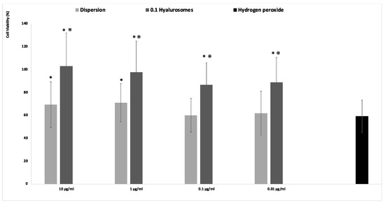 Viability of fibroblasts stressed with hydrogen peroxide and protected with Lavandula angustifolia extract in dispersion or loaded in hyalurosomes properly diluted to reach 10, 1, 0.1, 0.01 μg/mL of extract. Data are reported as mean values (n = 9) ± standard deviations (error bars) of cell viability expressed as the percentage of untreated cells (100% viability). Symbol (*) indicates that the viability of the cells treated with the extract in dispersion and loaded in 0.1 hyalurosomes are statistically different from that of cells treated with hydrogen peroxide (p < 0.05); symbol (⦿) indicates that the viability of the cells treated with 0.1 hyalurosomes is statistically different from that of cells treated with the extract in dispersion (p < 0.05).