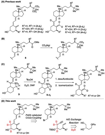 Synthetic strategy of deuterium-labeled D3 metabolites. (A) Structures of reported deuterium-labeled D3 metabolites. (B) Previous work on the synthesis of 2–4-d6. (C) Previous work on the synthesis of 2–4-d3 (D) This work: general synthesis of deuterium-labeled D3 metabolites.