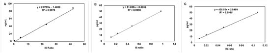 Calibration curve of D3 metabolites; (A) 25(OH)D3 (2); (B) 25(OH)D3-23,26-lactone (6); and (C) 1,25(OH)2D3-23,26-lactone (7).