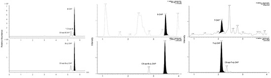 In the case of the DAP-adducts of 2 and 2-d3 (Figure 3A,B), we observed identical ion peaks at the retention time of 5.60 min (abbreviated as tR: 5.60 min). Similarly, 6 and 6-d3 showed the same tR of 3.50 min, and 7 and 7-d3 showed the same tR of 2.15 min, indicating that the deuterium-labeled compounds are suitable as internal standards for the isotope dilution method. We also observed small peaks at the retention times of 5.20 min (Figure 3A,B), 2.65 min (Figure 3C,D), and 2.37 min (Figure 3E,F) for 2/2-d3, 6/6-d3, and 7/7-d3, respectively. These peaks are due to the epimers at C6 of the DAP adducts, because DAP-PA reacts from both the α- and β-faces.