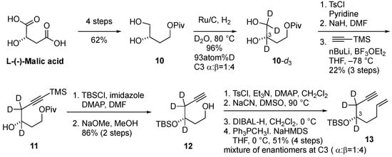 We employed a convergent strategy using the palladium-catalyzed coupling reaction of enyne-type deuterium-labeled A-ring precursors 13-d3 and 16-d3 with bromoolefins 17 and 18 as the CD-ring moieties. The deuterium atoms in 13-d3 and 16-d3 were introduced by the H/D exchange at the a-position of the alcohol, as reported by Sajiki et al. [28]. Our synthesis of deuterium-labeled enyne 13 commenced with the H/D exchange reaction of alcohol 10, which was obtained from L-(-)-malic acid in 4 steps (Scheme 1) [29]. The alcohol 10 was subjected to the H/D exchange reaction with a catalytic amount of Ru/C in D2O at 80 °C under an H2 atmosphere to afford 10-d3 deuterium-labeled at C3 and C4 in a 96% yield with over 93% deuteride content [28]. In this reaction, the stereochemistry at C3 was isomerized (4:1 ratio of α-10a and β-10b). The deuterium-labeled alcohol 10 (enantiomeric mixture) was converted into alkyne 11 by tosylation of the primary alcohol followed by epoxidation with NaH and reaction with TMS-acetylene (22% yield from 10-d3). The hydroxyl group in alkyne 11 was protected with TBS ether, followed by deprotection of the TMS and pivaloyl groups with NaOMe in MeOH to give the alcohol 12 in an 86% yield from 11. Enyne 13 was obtained in a 51% yield from 12 via 4 steps, (i) tosylation of the primary alcohol; (ii) cyanation with NaCN; (iii) reduction of the nitrile group with DIBAL-H to aldehyde; and (iv) a Wittig reaction with Ph3PCH3I and NaHMDS. It was confirmed by 1H-NMR that the deuteration rate did not decrease in these reaction steps [30].
