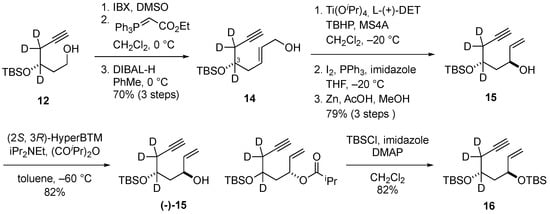 Next, the deuterium-labeled enyne 16 bearing a hydroxyl group at C1α was synthesized (Scheme 2). The alcohol moiety in 12 was oxidized with an IBX and the resulting aldehyde was reacted with a HWE Wittig reagent to give an unsaturated ester, whose ester group was reduced with a DIBAL-H to give allyl alcohol 14 in a 70% yield from 12 [31,32]. The allyl alcohol 14 was subjected to a Sharpless asymmetric epoxidation with a TBHP in the presence of Ti(OiPr)4 and L-(+)-DET [33], and the resulting epoxy alcohol was subjected to iodination with iodine and triphenylphosphine followed by treatment with zinc to give a secondary alcohol 15 in a 79% yield (3 steps) [31,32]. The diastereomer ratio at C1 in 15 was 10:1, and the undesired C1β diastereomer was removed by kinetic resolution, using acylation with isopropyl acid anhydride in the presence of (2S,3R)-HyperBTM [34], to give (-)-15 in an 82% yield as a single diastereomer. The undesired diastereomer at C3 was also removed via silica gel column purification. The deuterium-labeled enyne 16, in which the secondary alcohol was protected as the TBS ether, was obtained in an 82% yield.