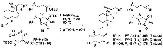 The palladium-catalyzed coupling reaction of 13-d3 and bromoolefin 17 followed by deprotection of the silyl groups provided 25(OH)D3-d3 (2-d3) in a 36% yield [35]. Next, 25(OH)D3-23,26-lactone-d3 (6-d3) and 1,25(OH)2D3-23,26-lactone-d3 (7-d3) were similarly synthesized by reacting bromoolefin 18 and enynes 13-d3 and 16-d3, respectively [36]. In the synthesis of 2-d3 and 6-d3, the undesired diastereomers at C3α were separated by an HPLC (Scheme 3).