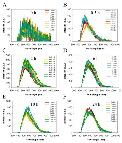 Light intensity spectra (a total of 34 measurements) of the nuclear area of the cells without CNDs (A) or with 750 µg/mL of CNDs for different incubation times from 0.5 h to 24 h (B–F).