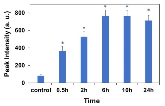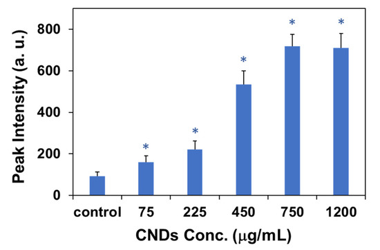 Light intensity of nucleus region of cells with 750 µg/mL of CNDs incubation as a function of time for incubation. The error bar shows the standard deviation. * Stands for a significant difference from the control (0 mg/mL) (p < 0.05) via a statistical analysis.