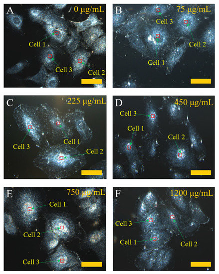 Dark-field images of cells incubated without CNDs (A) or with CNDs for 24 h using different concentrations ranging from 75 μg/mL to 1200 μg/mL (B–F). All the scale bars are 4 μm.