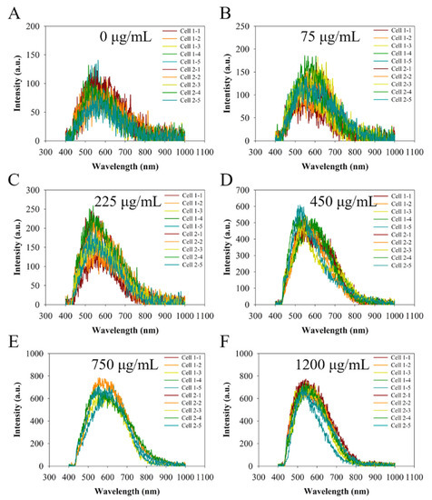 The quantitative determination of the light signals (from the 34 points) in the nucleus (Figure 5) was further performed by analyzing the hyperspectral spectra via the ENVI software. The results are presented in Figure 6. The light intensity shows a monotonic increase with the increase in the incubation concentration of CNDs up to 750 μg/mL (Figure 7). At the range of CND concentration from 0 to 225 μg/mL, the peak light intensity is gradually increased from 100 a.u. to 220 a.u. At an incubation concentration of 450 μg/mL or higher, the light intensity increases dramatically to >500 a.u. (max), suggesting a great amount of CND penetration into the nucleus of the cells. However, a feature of constant light intensity is observed when the CND concentration for incubation is beyond 750 μg/mL, suggesting a saturation of CND penetration with the incubation concentration of 750 μg/mL or higher.