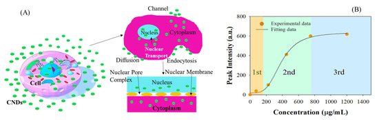 Three basic mechanisms have been proposed for interpreting how nanoparticles enter cells: endocytosis, penetration through channels, and direct diffusion across the plasma membrane [60,61]. According to the characteristics of the CNDs’ structures, it is plausible that the penetration of CNDs into the cells involves the synergistic effects of direct diffusion across the plasma membrane, receptor-mediated and/or fluid-phase endocytosis, and passing through the channels in the plasma membrane, followed by CND nuclear penetration through the nuclear pore complex (NPC), one kind of large proteinaceous assembly. Figure 8A schematically shows a proposed penetration process. The nuclear membrane contains the NPCs, which can function as selective channels for the transport of molecules and the mediation of nucleocytoplasmic exchange [62,63].