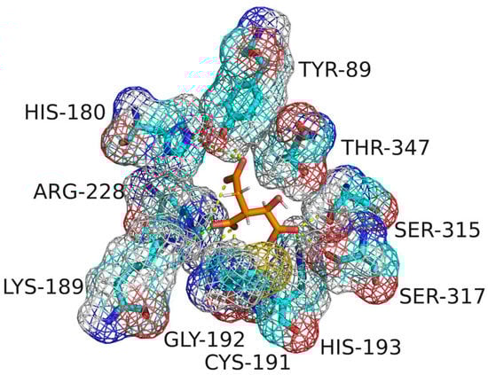 After CDOCKER docking, 60 compounds with a -CDOCKER interaction energy >50 kcal/mol were selected for the next step of manual selection. The mode of interaction of isocitrate as the natural substrate for MtICL was compared with the binding modes of the candidate compounds for MtICL. As shown in Figure 1, the oxygen atoms of the carbonyl and hydroxyl groups of isocitrate are the main hydrogen bond receptors, forming conventional hydrogen bonds with amino acid residues in the active sites, such as TYR89, GLY192, SER315, SER317, and THR347. In addition, HIS180, LYS189, HIS193, and ARG228 form electrostatic interactions with isocitrate. To simplify the picture, some amino acid residues with weak interaction forces are hidden. This is consistent with the reported situation of essential amino acid residues in the MtICL active site [35]. Similarly, consistent results are observed for the interactions of 3-BP and IA. As shown in Figure 2, GLY192, SER315, THR347, ASN313, and HIS193 of MtICL interact with the oxygen atoms of 3-BP. GLY192, HIS198, ASN313, SER315, SER317, and THR347 are key residues involved in hydrogen bonding. IA forms hydrogen bonds with GLY192, HIS193, ASN313, SER315, THR317, and THR347 of MtICL and forms electrostatic interactions with LYS189, HIS180, and ARG228. Depending on the -CDOCKER interaction energy >50 kcal/mol and the binding models consistent with those of the reference compounds to the essential amino acid residues of MtICL, as shown in the 2D diagrams (Table S1), 11 compounds with structures different from those natural substrate analogs were selected for further experimental verification (Table 1).
