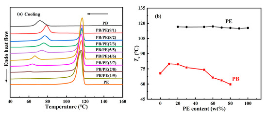 (a) DSC cooling curves of blends and pure polymers. (b) The cooling crystallization temperatures (Tc) as a function of PE content.
