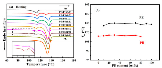 (a) DSC heating curves of blends and pure polymers. (b) The melting temperatures (Tm) as a function of PE content.