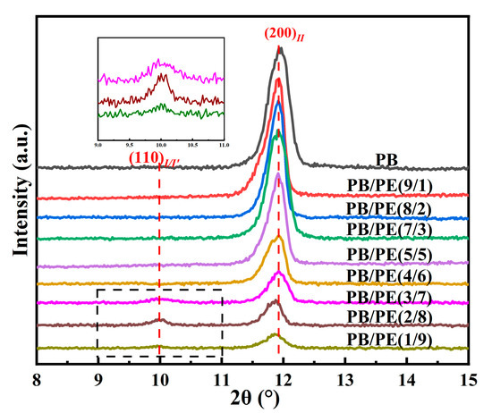 In order to disclose the crystalline modification of cooling crystallization, XRD experiments were performed on the samples prepared with the same thermal process as the above DSC experiments. As shown in Figure 3, a distinct diffraction peak was observed at 2θ = 11.9°, which corresponds to the (200)II crystallographic planes of the PB tetragonal form II. In contrast, the diffraction peaks at 2θ = 9.9° of (110)I/I′ crystallographic planes in the PB trigonal phase were also observed in PB/PE(3/7), PB/PE(2/8), and PB/PE(1/9). The appearance of the trigonal phase is consistent with the additional melting peaks observed in the DSC heating curves (Figure 2a). It was indicated that the trigonal phase that was crystallized directly from the amorphous melt, referred to as form I′, is generated during the cooling crystallization of PB/PE(3/7) and PB/PE(2/8).