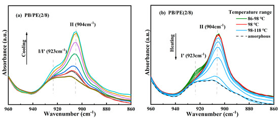After that, to verify the modification of crystallites corresponding to the additional melting peaks at a low temperature, in situ FTIR experiments were carried out to closely track the real-time cooling crystallization and melting processes of PB/PE(2/8) and PB/PE(3/7). It can be seen from Figure 4a that, during cooling, the characteristic absorption band at the wavenumber of 904 cm−1, which originates from the tetragonal form II, increases earlier than that at 923 cm−1 of the trigonal phase. During the following heating (Figure 4b), the characteristic signal of the trigonal phase at 923 cm−1 began to decrease at 86 °C (green curves) and disappears completely at 98 °C (red curve). However, the characteristic signal at 904 cm−1 of form II remains unchanged during heating. The lower melting temperature indicates that all the trigonal crystals formed by cooling is form I′, whereas there is no form I transformed from form II. As the temperature was continuously elevated, the intensity of the form II absorption band at 904 cm−1 decayed and completely disappeared at around 118 °C, consistent with PB/PE(3/7) (Figure S1). These results demonstrate that the mixed crystals of forms II and I′ are generated for PE content ≥ 70 wt%, while only tetragonal form II can be formed during cooling crystallization in the blends with less than 70 wt% PE. This is different from the previous study where a presence of less than 30% PE can induce the appearance of PB form I′ in the cooling process [62]. In reality, it has been demonstrated by the systematic investigation on polybutene/propylene blends that the crystallization of polybutene is strongly dependent on the molecular weights of both PB and the matrix [55]. Thus, these different PE thresholds to induce form I′ might be associated with distinct molecular weights. In this work, the introduction of high PE content (≥70 wt%) greatly reduces the crystallization capacity of PB, as shown by the obviously decreased copolymer Tc with respect to pure PB (Figure 1b). In this case, the crystallization advantages of form II may reduce so much that form I′, which is the most thermodynamically stable, has the chance to grow detectably.