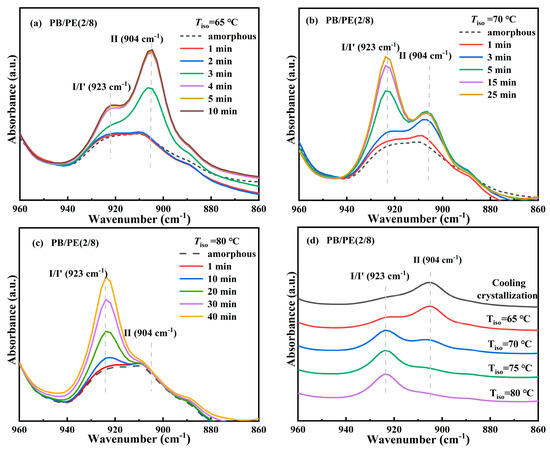 In situ FTIR spectra of PB/PE(2/8) obtained during isothermal crystallizations at (a) 65, (b) 70, and (c) 80 °C. (d) The summarized FITR spectra of PB/PE(2/8) after isothermal crystallization at different temperatures.