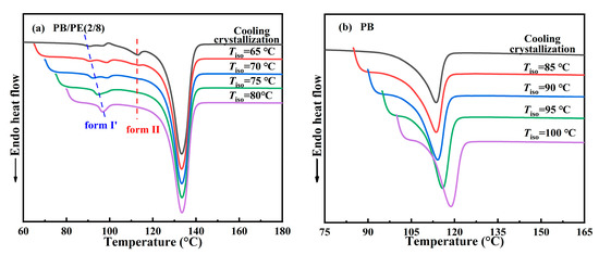 Afterwards, the DSC experiments were utilized to examine the correlation between polymorphism and temperature for other blends. Figure 7a shows the DSC heating curves of PB/PE(3/7) obtained by isothermal crystallization at different temperatures. It can be seen that when the temperatures of isothermal crystallization are not higher than 80 °C, the DSC heating curves show both the melting peaks of form II and form I′, indicating that forms II and I′ are generated within the isothermal crystallization process. The content of form I′ increases with increasing isothermal temperature and pure form I′ can be obtained, similar to the above PB/PE(2/8). However, the lowest threshold temperature of obtaining pure form I′ increased to 85 °C for PB/PE(3/7) with respect to 80 °C for PB/PE(2/8).