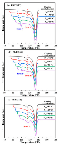 Figure 7b presents the heating process of PB/PE(4/6) after the isothermal crystallization blend with the increased fraction of PB. It is interesting to observe that the isothermal crystallization at 75–90 °C largely promotes the formation of form I′, whereas the cooling crystallization generated pure form II (Figure 2a and Figure 3). Notably, in the PB/PE(4/6) blend, there are always the mixture of forms I′ and II for the approachable isothermal temperatures up to 90 °C. Furthermore, Figure 7c displays that in PB/PE(5/5), only form II was formed within the isothermal crystallization, similar to pure PB. The absence of form I′ was found in the isothermal experiments of blends with further reduced PE fractions below 50 wt% (DSC results of PB/PE(8/2) and PB/PE(7/3) are provided in Figure S4).