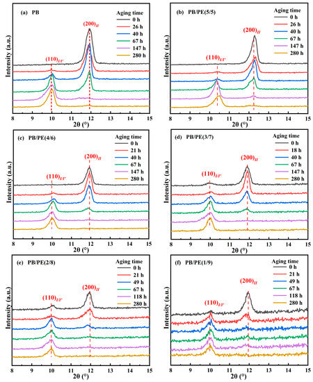 The XRD results of (a) PB, (b) PB/PE(5/5), (c) PB/PE(4/6), (d) PB/PE(3/7), (e) PB/PE(2/8), and (f) PB/PE(1/9) after aging at 25 °C for different durations.