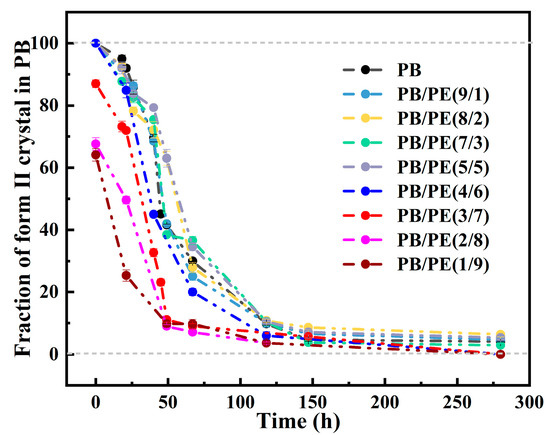 where A(110)I/I′ and A(200)II are the integral areas of the (110)I/I′ and (200)II diffraction peaks, respectively. As shown in Figure 9, the transition kinetics are comparable for the PB/PE blends with no more than 50 wt% PE. When the PE content reaches 70 wt%, the phase transformation of form II into form I is obviously accelerated, with respect to pure PB, which further increases with adding more of the PE component.