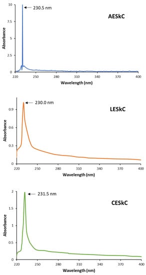 In general, collagen could be characterized using the UV-vis spectra in the absorption wavelength of 220 nm to 240 nm, which represents the presence of C=O, -COOH, and CO-NH2 groups in the collagen triple helix [14]. As shown in Figure 1, AESkC, LESkC, and CESkC exhibited prominent peaks at 230.5 nm, 230.0 nm, and 231.5 nm, respectively.