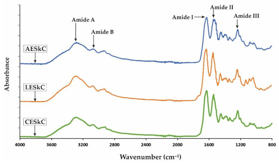 The Fourier transform infrared spectroscopy was conducted at a wavelength that ranged from 4000 cm−1 to 400 cm−1, and the spectra is shown in Figure 2. Similar FTIR spectra were projected by AESkC, LESkC, and CESkC. The main absorption peaks, such as amide A, amide B, amide I, amide II, and amide III, could be observed in the amide region and were clearly assigned in Table 2.