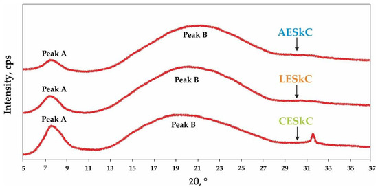 X-ray diffraction diagram of lizardfish skin collagens extracted with different acids. AESkC: acetic acid-extracted collagen; LESkC: lactic acid-extracted collagen; CESkC: citric acid-extracted collagen.