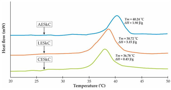 DSC thermograms of all extracted collagens derived from the lizardfish skin (by-product) are presented in Figure 5. The results show the Tmax values of 40.24 °C, 38.72 °C, and 36.78 °C of AESkC, LESkC, and CESkC, respectively. The highest thermal stability was observed in the AESkC sample with a denaturation enthalpy (ΔH) at 1.90 J/g. For the ΔH point, however, the highest value was recorded in the LESkC (3.15 J/g).