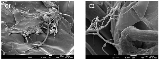 Field emission scanning electron microscopy images (FESEM) of lizardfish skin collagens extracted with different acids. (A1) acetic acid-extracted collagen at 500× magnification; (A2) acetic acid-extracted collagen at 10,000× magnification; (B1) lactic acid-extracted collagen at 500× magnification; (B2) lactic acid-extracted collagen at 10,000× magnification; (C1) citric acid-extracted collagen at 500× magnification; (C2) citric acid-extracted collagen at 10,000× magnification.