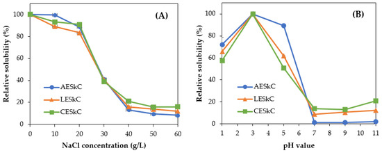 Solubility evaluation of lizardfish skin collagens extracted with different acids. (A) at different pH level and (B) at NaCl treatment. AESkC: acetic acid-extracted collagen; LESkC: lactic acid-extracted collagen; CESkC: citric acid-extracted collagen.
