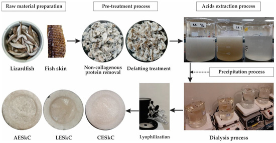 Extraction process of collagens from the skin of lizardfish. AESkC: acetic acid-extracted collagen; LESkC: lactic acid-extracted collagen; CESkC: citric acid-extracted collagen.