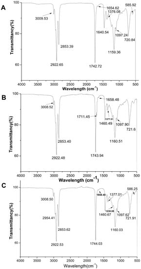 Infrared spectra of seed oils obtained from three types of Chenopodium quinoa Wild seed oils ((A) white; (B) red; (C) black).