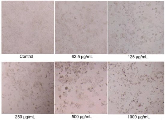 While BSO showed inhibitory effects on the growth of HCT116 cells for the first time, the anticancer activity of BSO was further investigated. Firstly, the effects of BSO on the morphology of HCT116 cell was observed by the inverted microscope (Figure 3). HCT116 cells are adhesive, fusiform, and refractile cells in standard culture conditions. The architecture of untreated HCT116 cells exhibited a typical homogeneously polygonal shape (Figure 2). Figure 2 displayed that cell proliferation was significantly inhibited by BSO with numerous floating dead cells at the concentrations of 125–1000 μg/mL. The shape of individual cells changed to circular, and led to cell shrinkage after treatment with a high concentration of BSO. This is the first study to report that BSO effectively inhibits colon cancer cell growth.