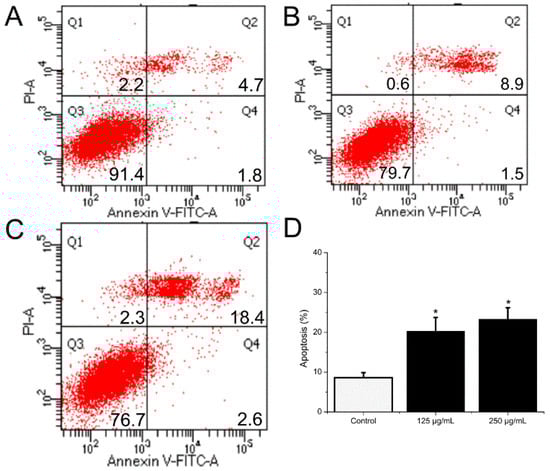 The influence of BSO on HCT116 cell apoptosis. Cells were collected after treatment and then stained with antibodies to annexin V and propidium iodide. After that, flow cytometry proceeded. BSO (125, 250 μg/mL) significantly promoted cell apoptotic. (A–C) Dot plot stained with annexin V and propidium iodide. (D) The percentages of apoptotic cells. As ± 3 replicate experiments were performed and the results were demonstrated in the form of means ± SD. * p < 0.05 versus control; * p < 0.05, versus negative control group. Q1, dead cells; Q2, dead/late apoptotic cells; Q3, normal cells;Q4, early apoptotic cells; Q2 + Q4, total apoptotic cells.