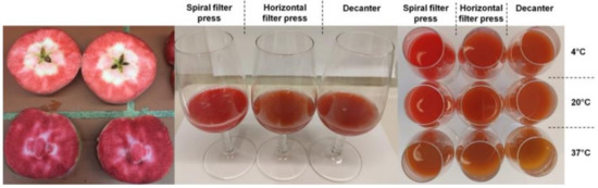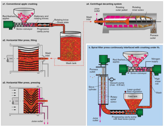 The aim of this study was to compare the stability of oxidation-sensitive compounds in red-fleshed apples, such as anthocyanins, during juice extraction with different pressing systems. Therefore, the apples were processed with an innovative vacuum-driven spiral filter press or two conventional processing approaches (hydraulic horizontal filter press and decanter) at pilot plant scale (ca. 200 kg per batch). The spiral filter press has been designed to enable minimal input of oxygen during solid–liquid separation for juice and puree production. After milling under nitrogen gas (N2), a progressing cavity pump with feed screw pump transports the mash continuously and rapidly within a closed system to the extraction cell. This cell consists of a sieve cylinder which is placed under reduced pressure and a screw helix (spiral) with mash channels that conveys the mash through the extraction cell. The pressure gradient causes the juice to leave the sieve into an inert atmosphere buffer tank, while the remaining solid part withheld by the sieve is ejected by the screw helix. Concomitantly to solid–liquid separation, the product gets de-aerated by the reduced pressure in the extraction cell. Immediate de-aeration might presumably be highly important despite milling under nitrogen, because substantial amounts of air with up to 14% oxygen [20] are expected to be trapped within the apples’ tissue in intercellular spaces, which have been reported to occupy from ca. 7 to 23% of the total fruit volume [21]. Therefore, besides avoiding oxygen input from the surrounding air, the whole process from milling under N2 to dejuicing and de-aeration should be as rapid and continuous as possible without large buffer tanks, if minimizing oxidative damage is the goal. An illustration of the technologies used in this study may be found in Figure 1.