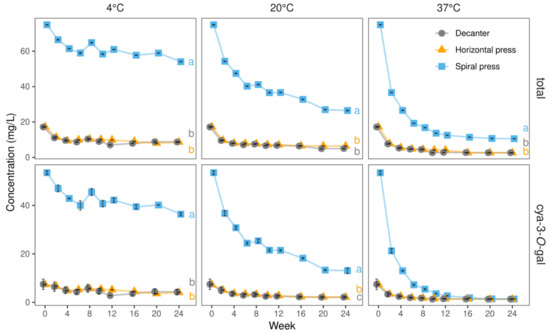 Levels of total anthocyanins and cyanidin-3-O-galactoside (cya-3-O-gal) in juices derived from three pressing systems in 2020 during 24 weeks of storage at 4, 20, and 37 °C. Data represent means and standard deviations of two technological replicates. Relative anthocyanin degradation was substantially more pronounced in spiral filter pressed juices, owing to their massively higher starting levels. Different letters (a, b) indicate significantly different (p < 0.05) means of the respective concentration at the end of the storage study.