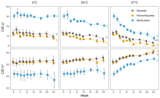 CIE-a* and -h° values of juices derived from three pressing systems during 24 weeks of storage at 4, 20, and 37 °C in 2020. Data represent means and standard deviations of two technological replicates. The substantially more reddish tonality of juices produced with spiral filter press was maintained throughout the full storage period at 4 °C. Although a minor and major degradation was observed at 20 and 37 °C, the color difference between spiral filter press-produced juices and those made with the other technologies was sustained. Different letters (a, b) indicate significantly different (p < 0.05) means of the respective color value at the end of the storage study.